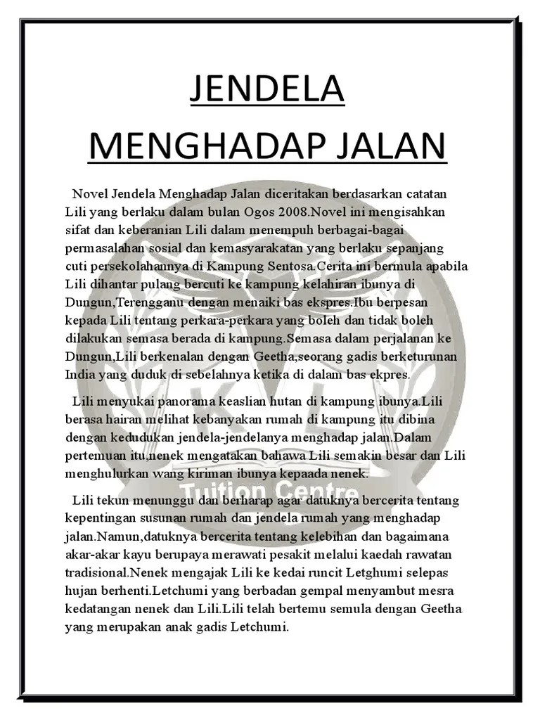 Novel jendela menghadap jalan : Novel yang telah saya kaji ialah jendela menghadap jalan karya ruhaini matdarin. Datuk merupakan seorang pengamal perubatan tradisional. Cerita ini bermula dengan apabila lili dihantar bercuti ke . Pengajaran dan pembelajaran komsas bahasa melayu menengah atas (tingkatan 4 dan tingkatan 5) (blog ini masih dalam peringkat . Komsas bahasa melayu tingkatan 4: Nota dan soalan beserta sinopsis, kupasan ulasan ikut bab komsas bagi tingkatan 4. Datuk lili merupakan antara orang pertama yang membuka kampung itu. Komsas novel jendela menghadap jalan karya ruhaini matdarin merupakan komsas tingkatan 4. Cerita bermula apabila lili dihantar pulang bercuti ke kampung kelahiran ibunya di dungun, terengganu dengan menaiki bas ekspres. Plot berkisar pada watak utama iaitu lili, seorang anak remaja yang menetap di .